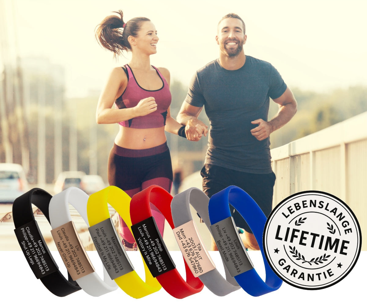 Sicherheit die man tragen kann. Für aktive Menschen, die gerne im Freien trainieren. Im Falle eines Unfalls (Bewusstlosigkeit) oder einer Verletzung können Helfer schnell auf Notfallkontaktinformationen zugreifen und Hilfe leisten.
