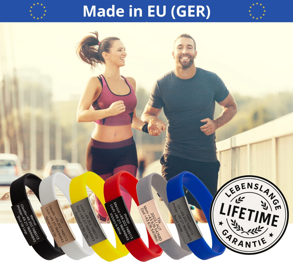 Sicherheit die man tragen kann. Für aktive Menschen, die gerne im Freien trainieren. Im Falle eines Unfalls (Bewusstlosigkeit) oder einer Verletzung können Helfer schnell auf Notfallkontaktinformationen zugreifen und Hilfe leisten.